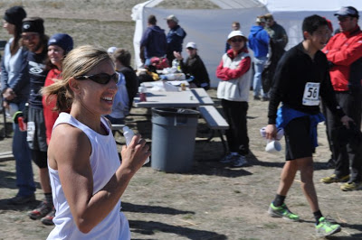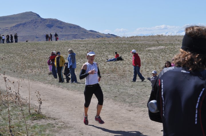 Trying to run hard downhill. Taking a potty break behind some (very far away) bushes. Slowly catching up to all 3 women that passed me. Keeping up the speed on the uphill. Trying to reel in Jen who is in the lead! Missing the (only) aid station because I am NOT about to let Jen go again. Passing Jen.