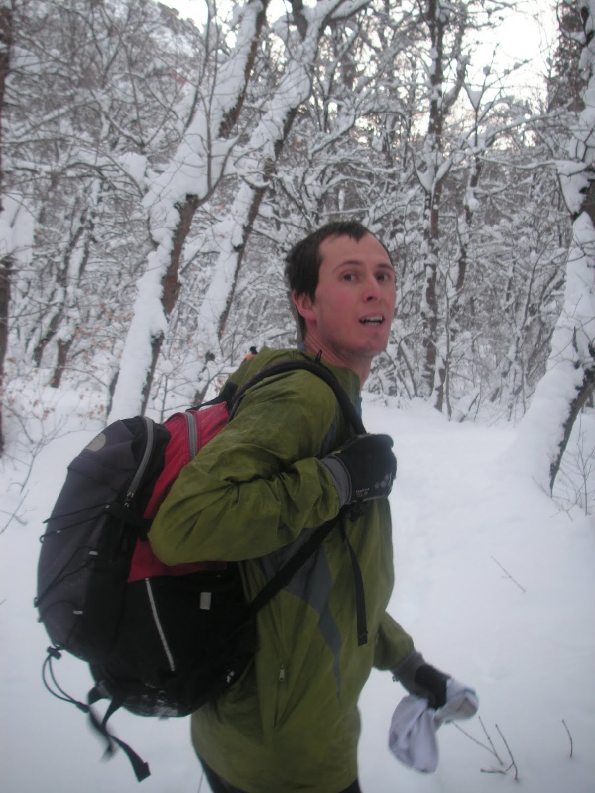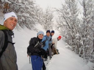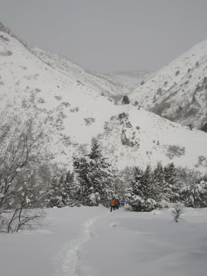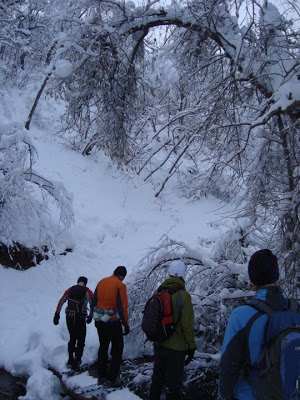 Jen, Heather, Anne, Karl, and I all squeezed into our Subaru and headed up Hobble Creek Canyon early Friday morning to meet up with Brian and Ben. We hiked for about 1.5 miles on the snow-covered road, and then we turned right to go up Day’s Canyon. At this point the 15F (-10C) were quite manageable.