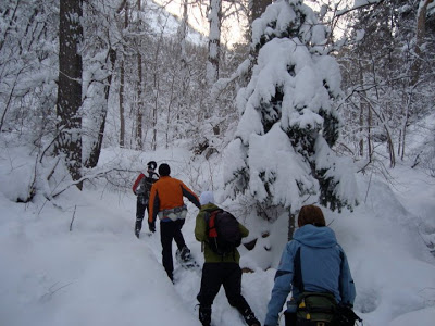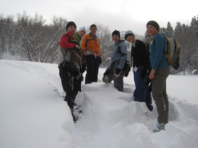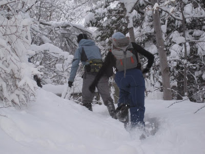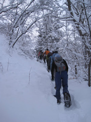 The snow was unbelievable. There was so much powder that, in spite of our snow shoes, the leader would sink in up to his/her knees. Being in front was hard work. Nobody lasted much longer than 10 minutes in front. It was that exhausting. Here I am making a trail for the rest of the crew.