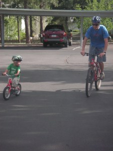 With 3 out of 4 family members racing in the Moab Tri, we figured we’d better practice our transitions before race day. Noah and Max were pretty stoked to be able to “work out” with us. We would all do some imaginary swimming (Karl is especially good at this discipline!), then run to our bikes, hope on, and ride one loop around the apartment complex.