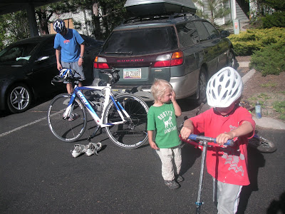 To make things more fun, Karl added in a few wheelies. So did Noah. Notice that we even brought the lion along in the bottle cage! After a lap of biking, we put on our running shoes and off we went again. On our 3rd bike lap, I attempted to practice a few cyclocross mounts and dismounts. Max is not used to me jumping on and off the bike, so he crashed into me full force and got quite some road rash. So we called it a day and did some more packing for our trip.