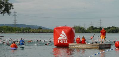 The lake was perfect. Clear and fairly warm. They gave us 15 minutes to warm up which I always appreciate. I was in the first wave with about 450 others, including the Pros. I figured I should line up on the side and stay out of trouble. Everybody else must have had the some idea because suddenly the middle was rather clear. So I went for it. I guess nobody was willing to tread water. I had the perfect spot and was having a blast from the second the cannon went off. It was certainly crowded but nothing like the swim in Vegas. About half-way I ended up right next to a girl and we swam side by side for a while. Then she decided to pull ahead and I jumped onto her feet and never let go. Score!
