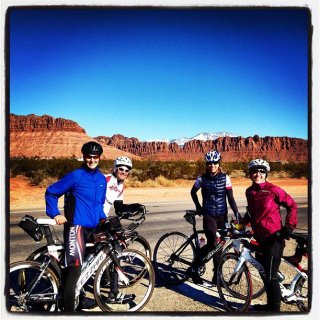 I was ready to roll with the PnT group. Spring break plus a race in Tucson made for a small turnout but luckily there was one other girl: my friend, Jena! Yay for someone to talk to. Even though I disguise myself as a roadie (road bike, socks, never a sleeveless jersey, gloves), the guys still won’t talk to me. It doesn’t really bother me, I just think it’s funny. They warmed up a little after an hour when there were about 10 of us left but I am not sure if I prefer silence or remarks such as: “Do you tri?” (How did they find out I am a triathlete?!?) or “You have a nice pair of legs. They look so strong, it’s almost scary!” (Which means that it’s really time to get down to racing weight because I am not interested in carrying these thighs up the St. George hills! Easier said than done…)