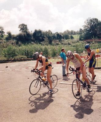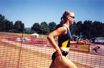 Fine. I’ll tell you when I think this picture was taken. (Mostly because I am really good at procrastinating writing that resume.) Somehow the race that comes to mind is a popular pool sprint back in 2003. I was back home in Germany for the summer, taking a break from my linguistics studies at BYU in Utah. So I signed up for some races. My boyfriend, DP, came to hang out and travel for a few weeks as well, and happened to be there for this one. So I dug up the lovely ‘bikini’!?! Actually, I am pretty sure I (mostly) chose this outfit because it was the only suitable thing to for a pool swim followed by a bike and a run. Apparently, he was neither impressed by this race kit nor by my overall win as he broke up with me at the end of the summer… Can’t blame the guy.