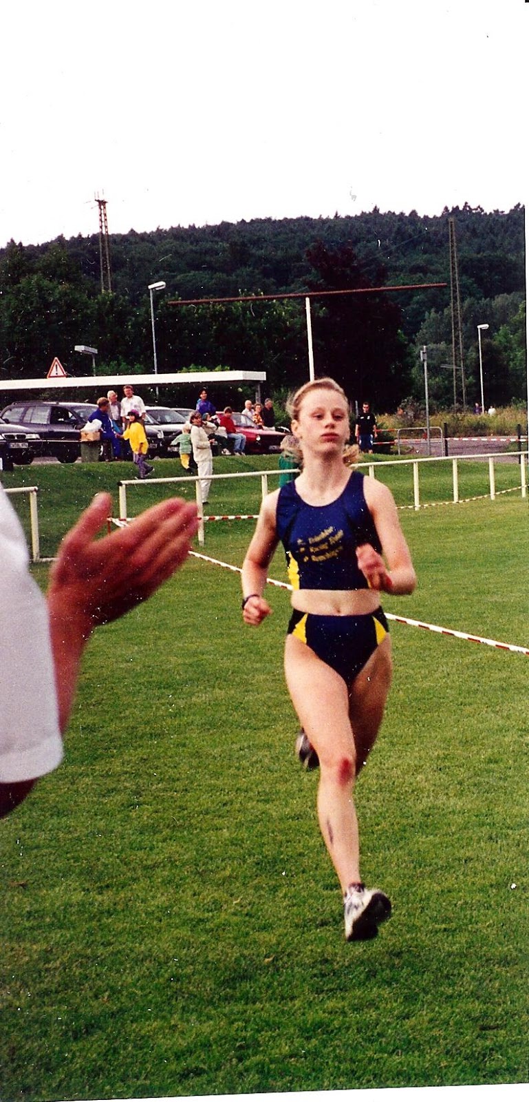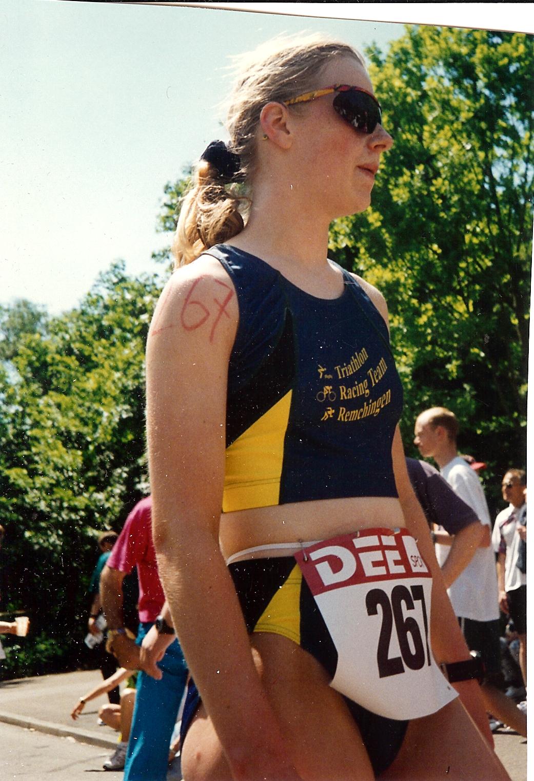 Fine. I’ll tell you when I think this picture was taken. (Mostly because I am really good at procrastinating writing that resume.) Somehow the race that comes to mind is a popular pool sprint back in 2003. I was back home in Germany for the summer, taking a break from my linguistics studies at BYU in Utah. So I signed up for some races. My boyfriend, DP, came to hang out and travel for a few weeks as well, and happened to be there for this one. So I dug up the lovely ‘bikini’!?! Actually, I am pretty sure I (mostly) chose this outfit because it was the only suitable thing to for a pool swim followed by a bike and a run. Apparently, he was neither impressed by this race kit nor by my overall win as he broke up with me at the end of the summer… Can’t blame the guy.