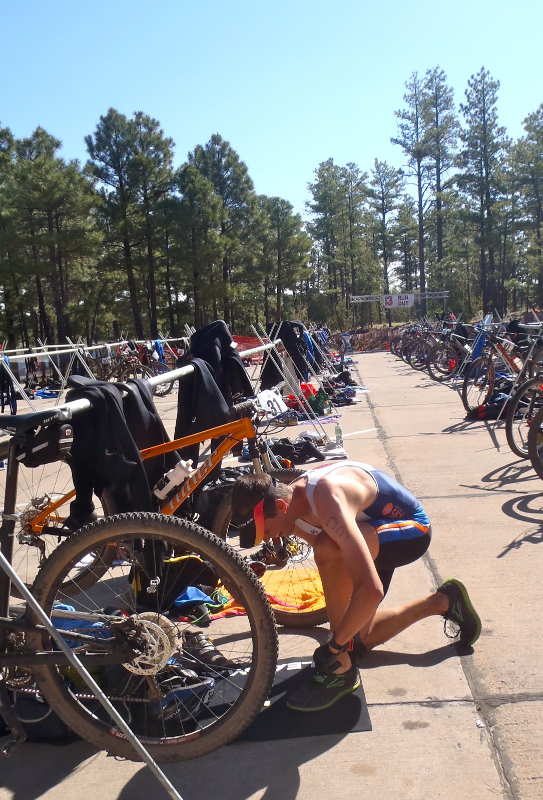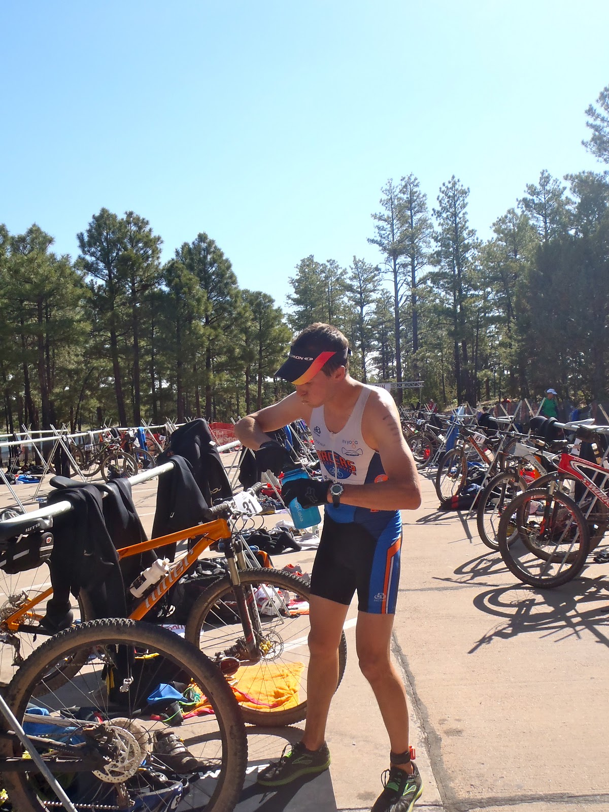 Karl, the hubster, had a great day as well! Having swum twice in the last year, I was just glad he made it out of the water alive (and not even close to last place)! He is an excellent mountain biker and put his skills to good work on a borrowed Diamond Back.