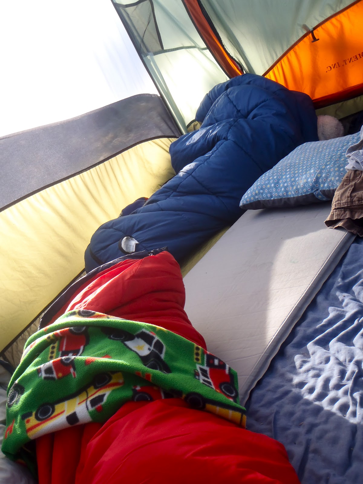 These kids are great little campers! Partly because they are so used to it. They almost sleep better and longer in our tent than they do at home. Here they are still asleep at 6:30 with the sun up and shining on our tent.