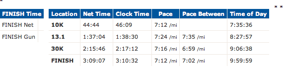 I told Karl that I wanted to run under 3:40. (Last year was 3:49, I think.) Ideally, I would break 3:30. If things went extremely well, maybe I could come in at 3:20. That’s all I was able to predict.